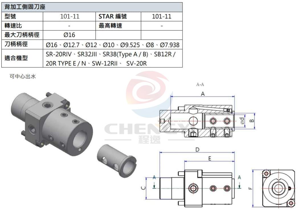 Model 101-11 STAR Number 101-11 Max tool shank diameter Ø16 Shank diameter Ø16, Ø12.7, Ø12, Ø10, Ø9.525, Ø8, Ø7.938 Applicable models SR-20RIV, SR32JII, SR38 (Type A/ B), SB12R/ 20R, TYPEE/ N, SW-12RI, SV-20R