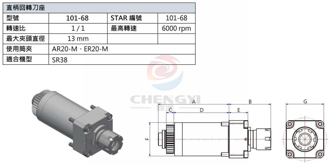 Model 101-68 STAR Number 101-68 Ratio 1/ 1 Maximum rpm 6000rpm Max collet diameter 13mm Using a Collet AR20-M, ER20-M Applicable models SR38