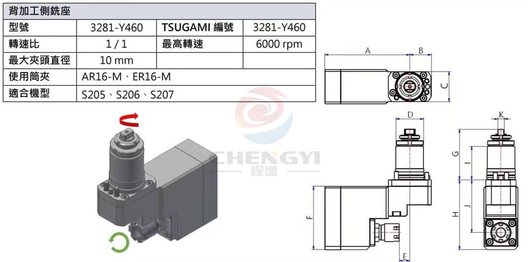 Model 3281-Y460 TSUGAMI Number 3281-Y460 Ratio 1/ 1 Maximum rpm 6000rpm Max collet diameter 10mm Using a Collet AR16-M, ER16-M Applicable models S205, S206, S207