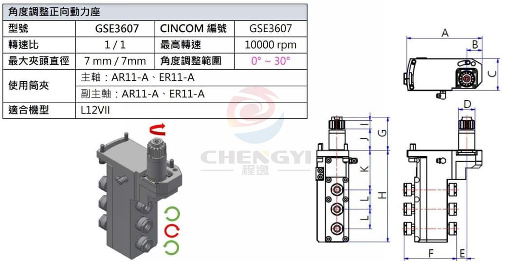 Model GSE3607 CITIZEN Number GSE3607 Ratio 1/ 1 Maximum rpm 10000rpm Max collet diameter 7mm/ 7mm Angle adjustment range 0°~30° Using a Collet Spindle: AR11-A, ER11-A Sub-spindle: AR11-A, ER11-A Applicable models L12VII