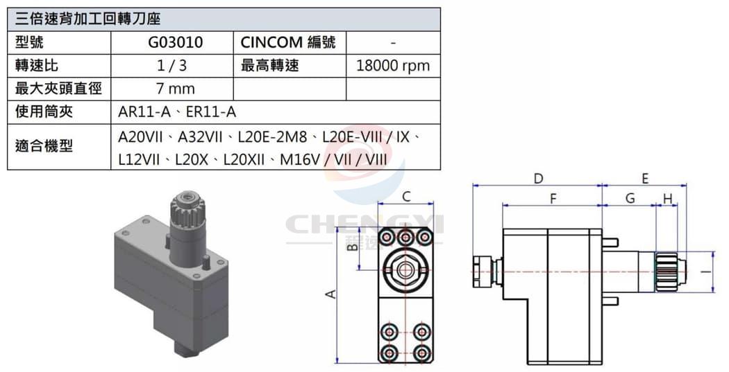 Model G03010 CITIZEN Number - Ratio 1/ 3 Maximum rpm 18000rpm Max collet diameter 7mm Using a Collet AR11-A, ER11-A Applicable models A2OVII, A32VII, L20E-2M8, L20E-VIII/ IX, L12VII, L20X, L20XII, M16V/ VII/ VIII Model A B C D E F G H I G03010 83.5 26.5 34 79.3 51.5 61 33 13 Ø25 unit: mm