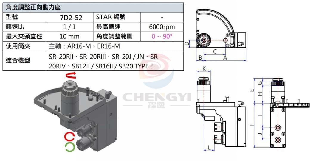 Model 7D2-52 STAR Number - Ratio 1/ 1 Maximum rpm 6000rpm Max collet diameter 10mm Angle adjustment range 0~90° Using a Collet Spindle: AR16-M, ER16-M Applicable models SR-20RII, SR-20RIII, SR-20J/ JN, SR-20RIV, SB12II/ SB16II/ SB20 TYPE E