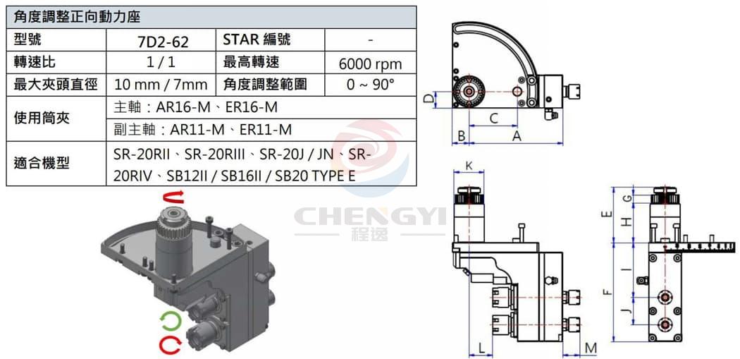 Model 7D2-62 STAR Number - Ratio 1/ 1 Maximum rpm 6000rpm Max collet diameter 10mm/ 7mm Angle adjustment range 0~90° Using a Collet Spindle: AR16-M, ER16-M Sub-spindle: AR11-M, ER11-M Applicable models SR-20RII, SR-20RIII, SR-20J/ JN, SR-20RIV, SB12II/ SB16II/ SB20 TYPE E