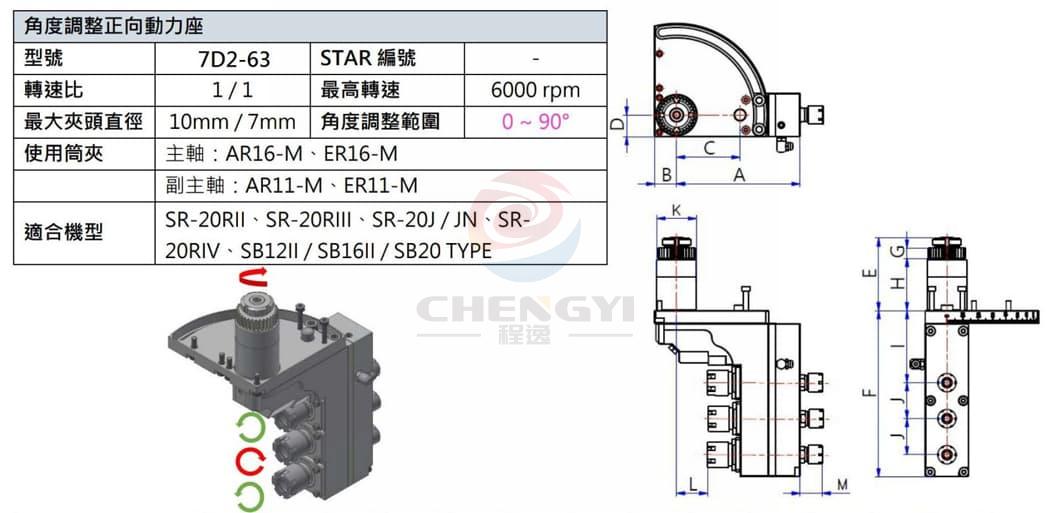 Model 7D2-63 STAR Number - Ratio 1/ 1 Maximum rpm 6000rpm Max collet diameter 10mm/ 7mm Angle adjustment range 0~90° Using a Collet Spindle: AR16-M, ER16-M Sub-spindle: AR11-M, ER11-M Applicable models SR-20RII, SR-20RIII, SR-20J/ JN, SR-20RIV, SB12II/ SB16II/ SB20 TYPE E