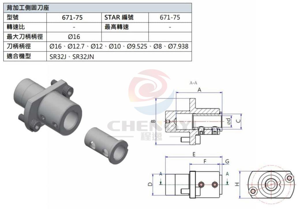 Model 671-75 STAR Number 671-75 Max tool shank diameter Ø16 Shank diameter Ø16, Ø12.7, Ø12, Ø10, Ø9.525, Ø8, Ø7.938 Applicable models SR32J, SR32JN